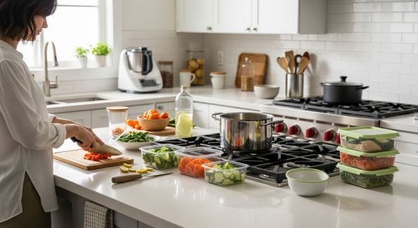 - Nettoyez après chaque étape : Prenez deux minutes entre chaque grande activité (après avoir découpé du cru, avant de lancer un dessert, etc.).
