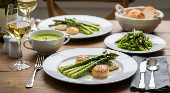 - Nordique : pain grillé, rillettes de truite, concombre à la crème légère aneth, radis roses, asperges vapeur, salade de pommes de terre froides.