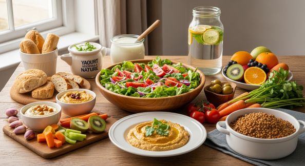 - Ne pas oublier fruits et crudités : pour la fraîcheur, le croquant et les fibres qui rassasient longtemps.