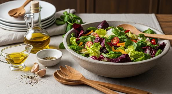 - Détaillez le pain en morceaux d’1 à 2 cm, humidifiez-les légèrement (eau + vinaigre), puis ajoutez tomates, concombre, oignon rouge, basilic, huile d’olive, olives.