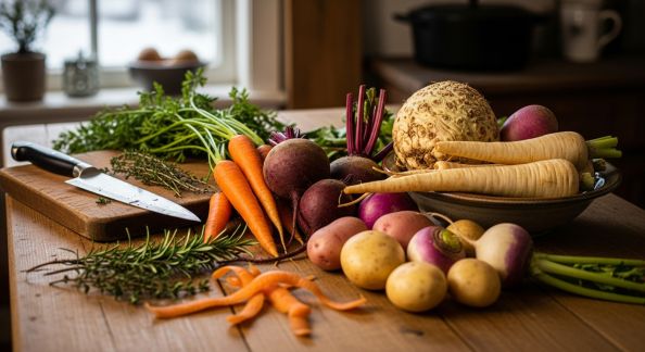 - Légumes racines : carottes, panais, navets, patates douces, céleri-rave, pommes de terre. Ils résistent au froid, se cuisinent rôtis, en purée ou en soupe.